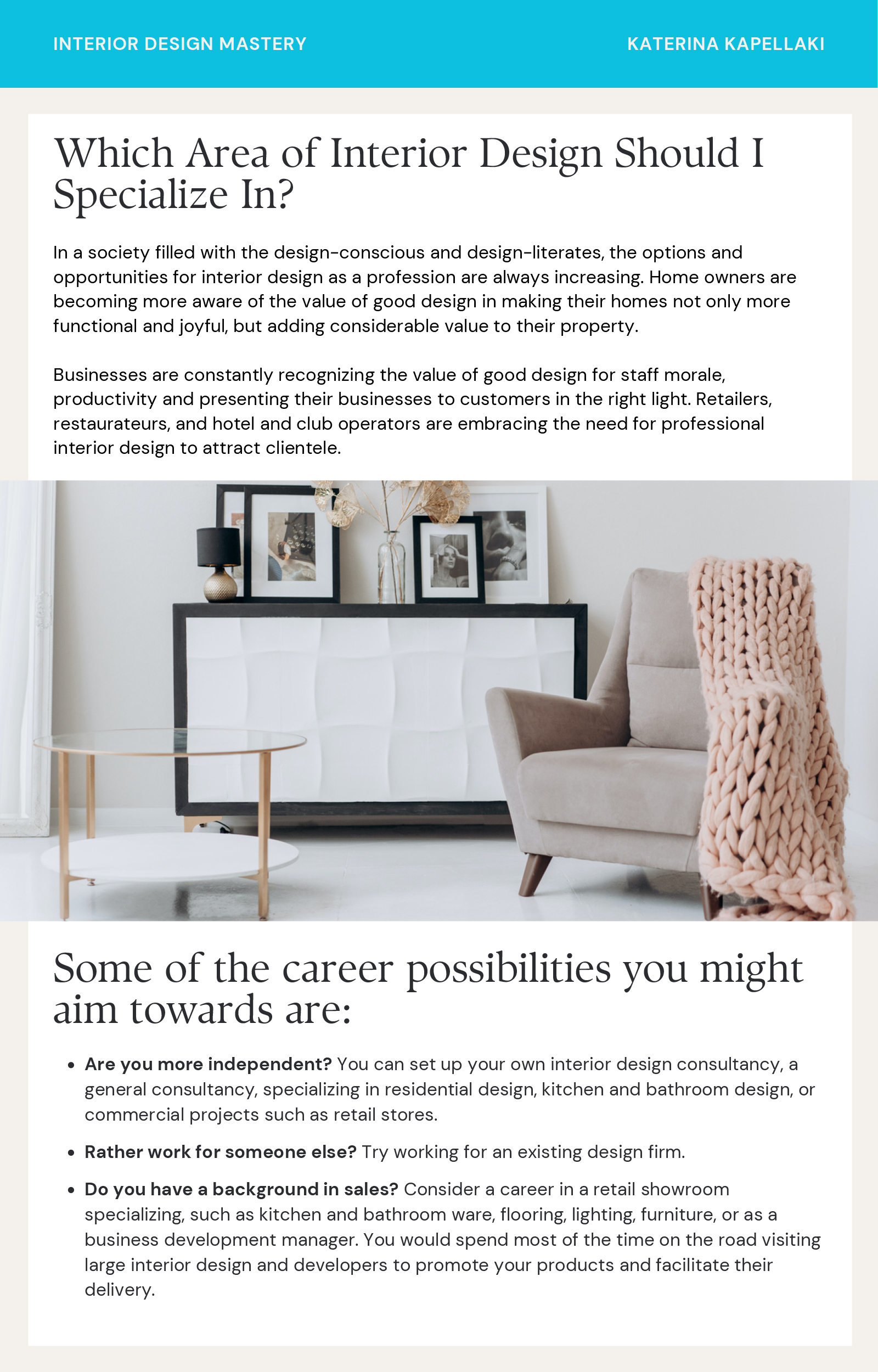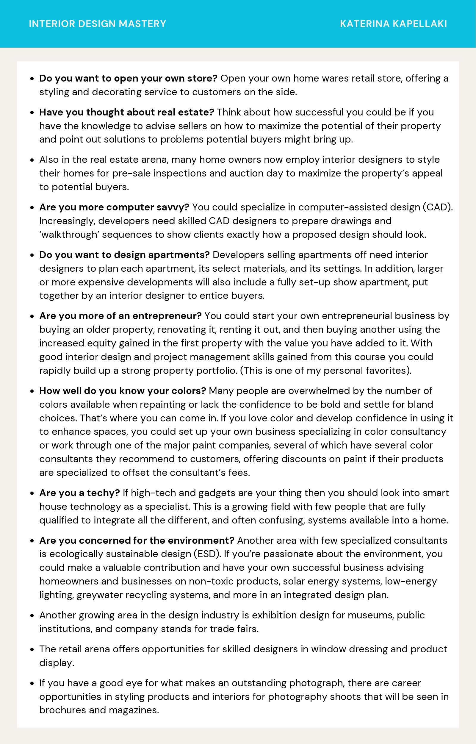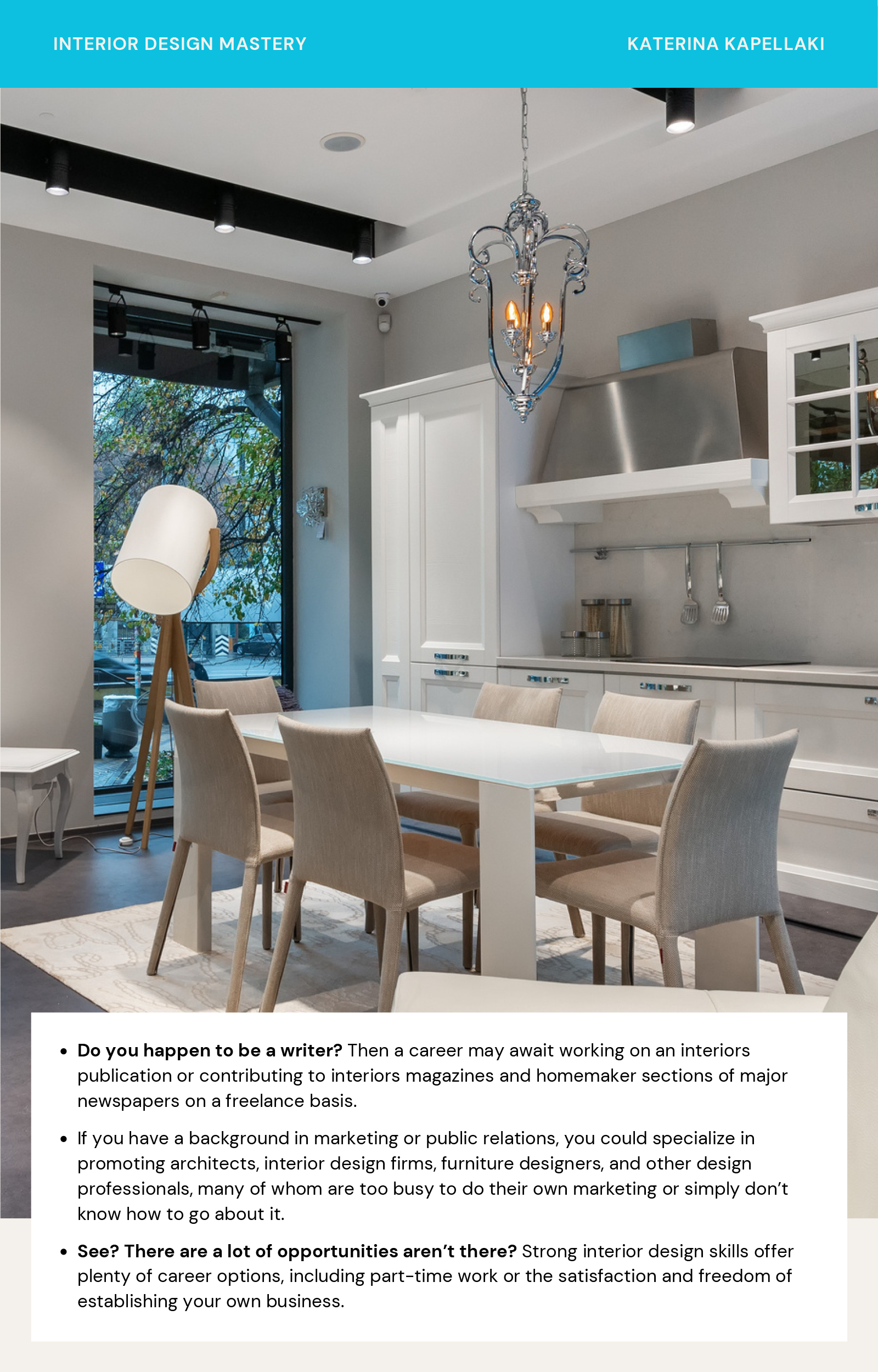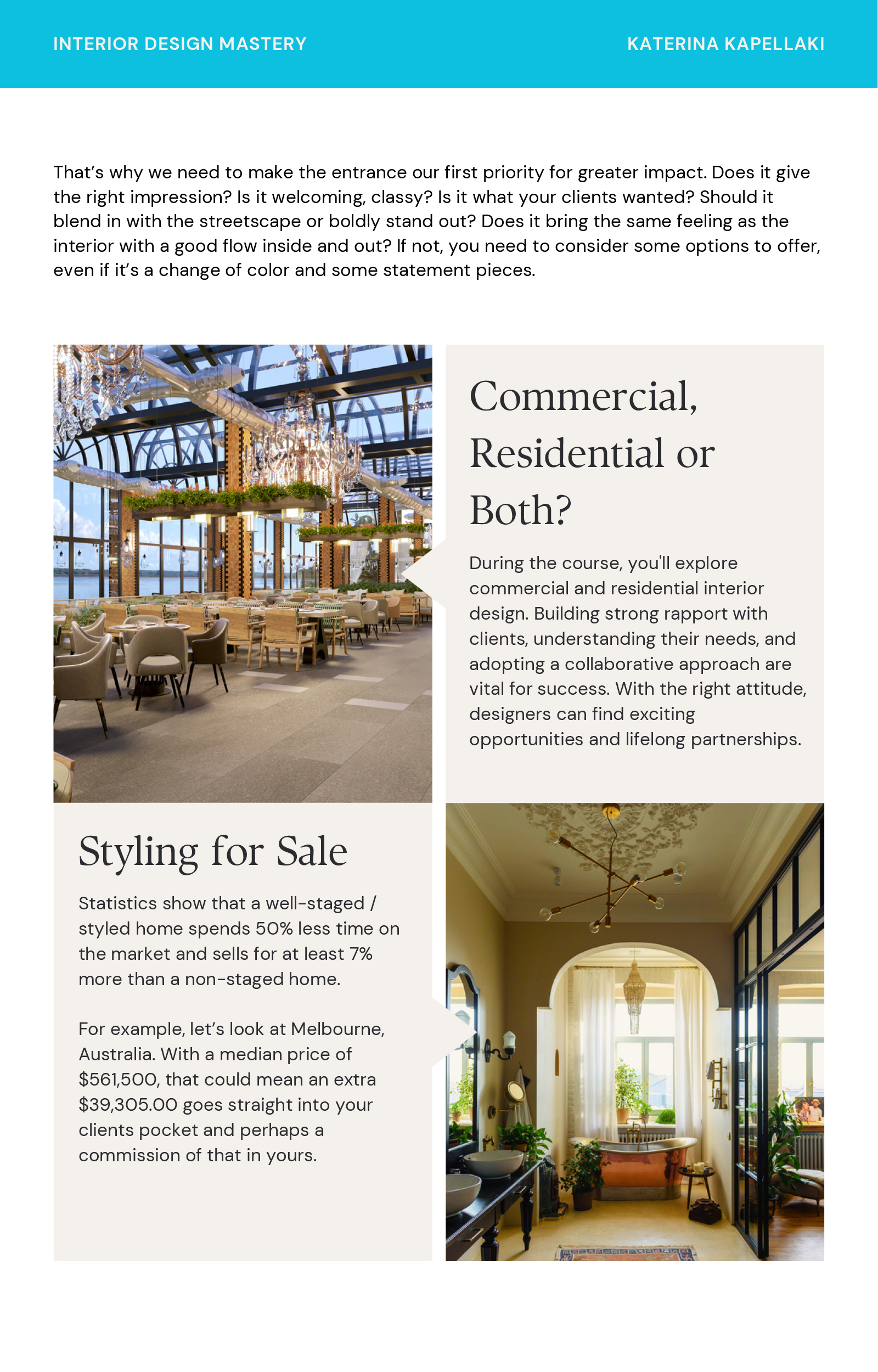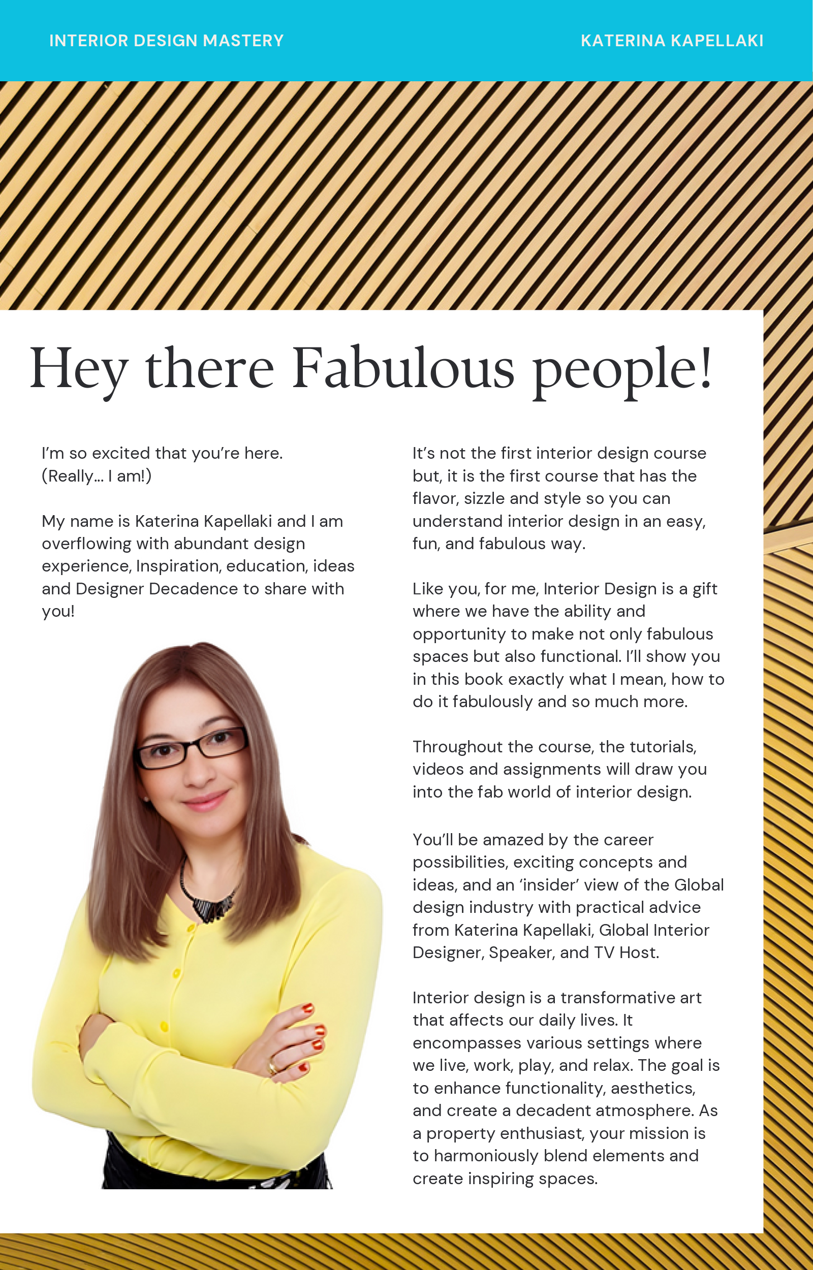 Unleash your creativity and master the art of interior design with this online course. Dive into a world of inspiration, education, and Designer Decadence as Katerina shares her wealth of design experience and ideas. Discover how to create fabulous and functional spaces, gain insider industry insights, and explore exciting career possibilities. Join Interior Design Mastery and let Katerina guide you on a captivating journey to transform spaces into stunning showcases of beauty and functionality. Get ready to make a difference and unlock your design potential one room at a time.